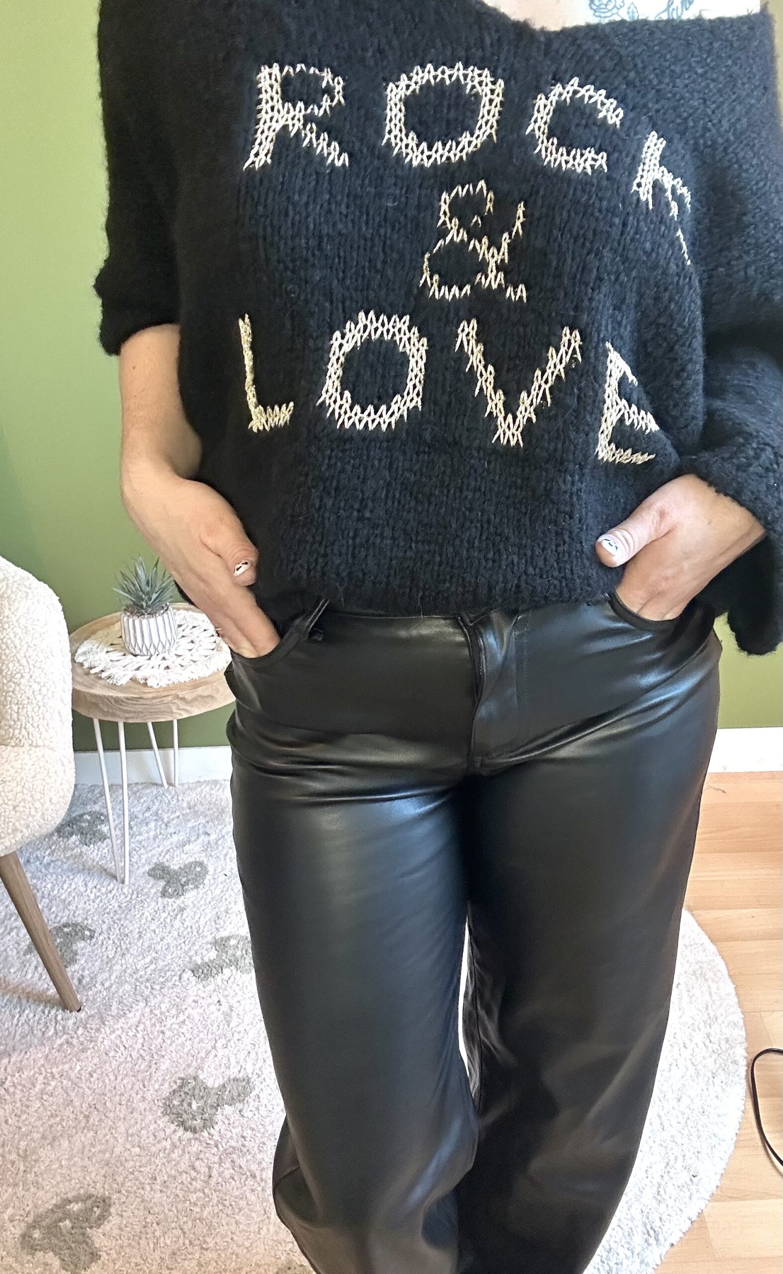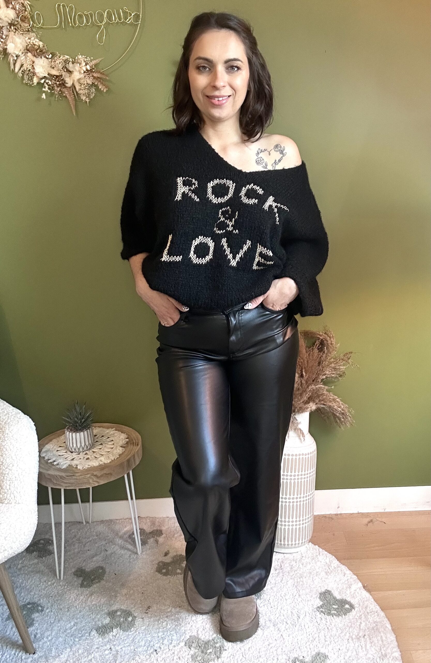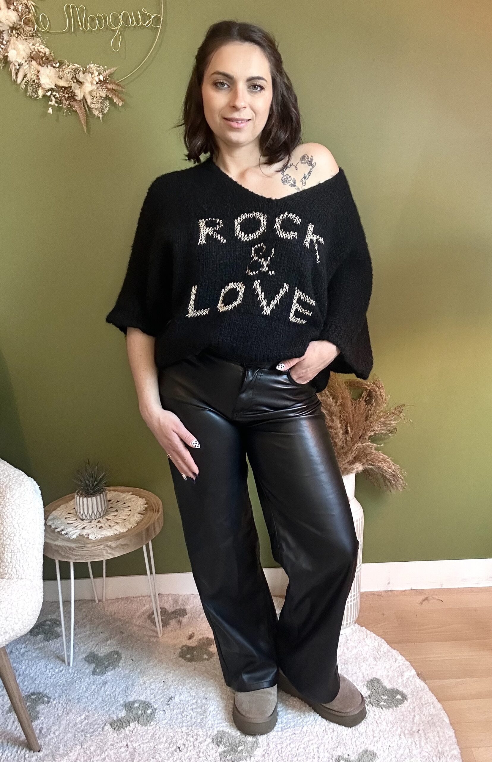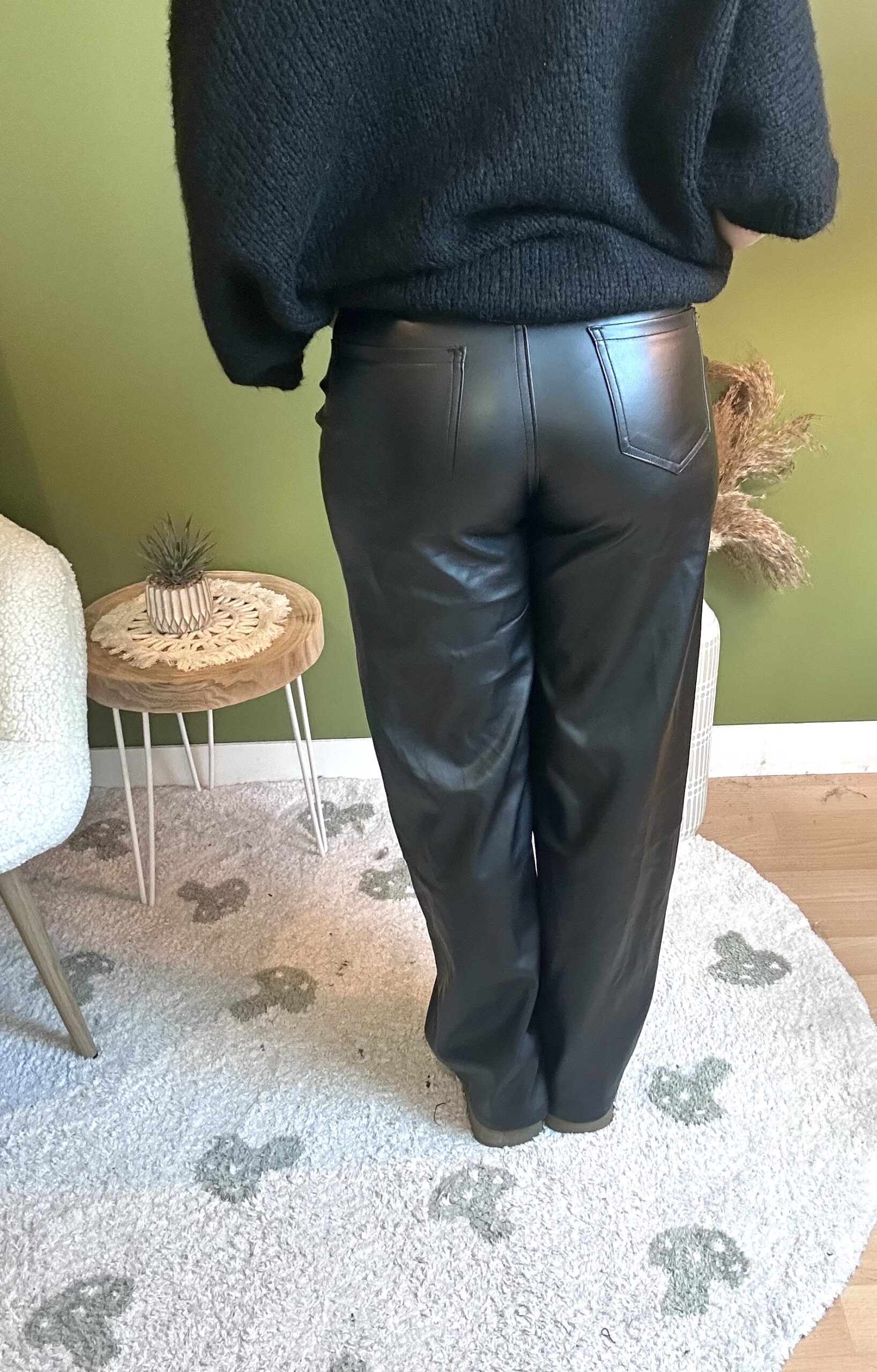Pantalon similicuir noir coupe droite, évasé en bas, Fermeture par bouton et Zip, 2 poches sur les côtés. Pantalon chic, confortable et tendance, idéal pour un look moderne.